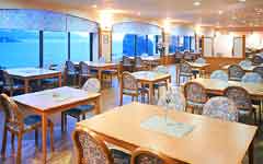 伊豆ならではの旬の海鮮料理を、お洒落な雰囲気の中でお楽しみいただけるのが、「~四季の広場~フルマーレ」です。 海側に設けられた広々とした窓からは、朝に夕に美しく移り変わる堂ヶ島の自然美もご覧いただくことができ、 これもまたご馳走のひとつ。朝夕のお食事はもちろん、パーティ会場としても利用可能です。